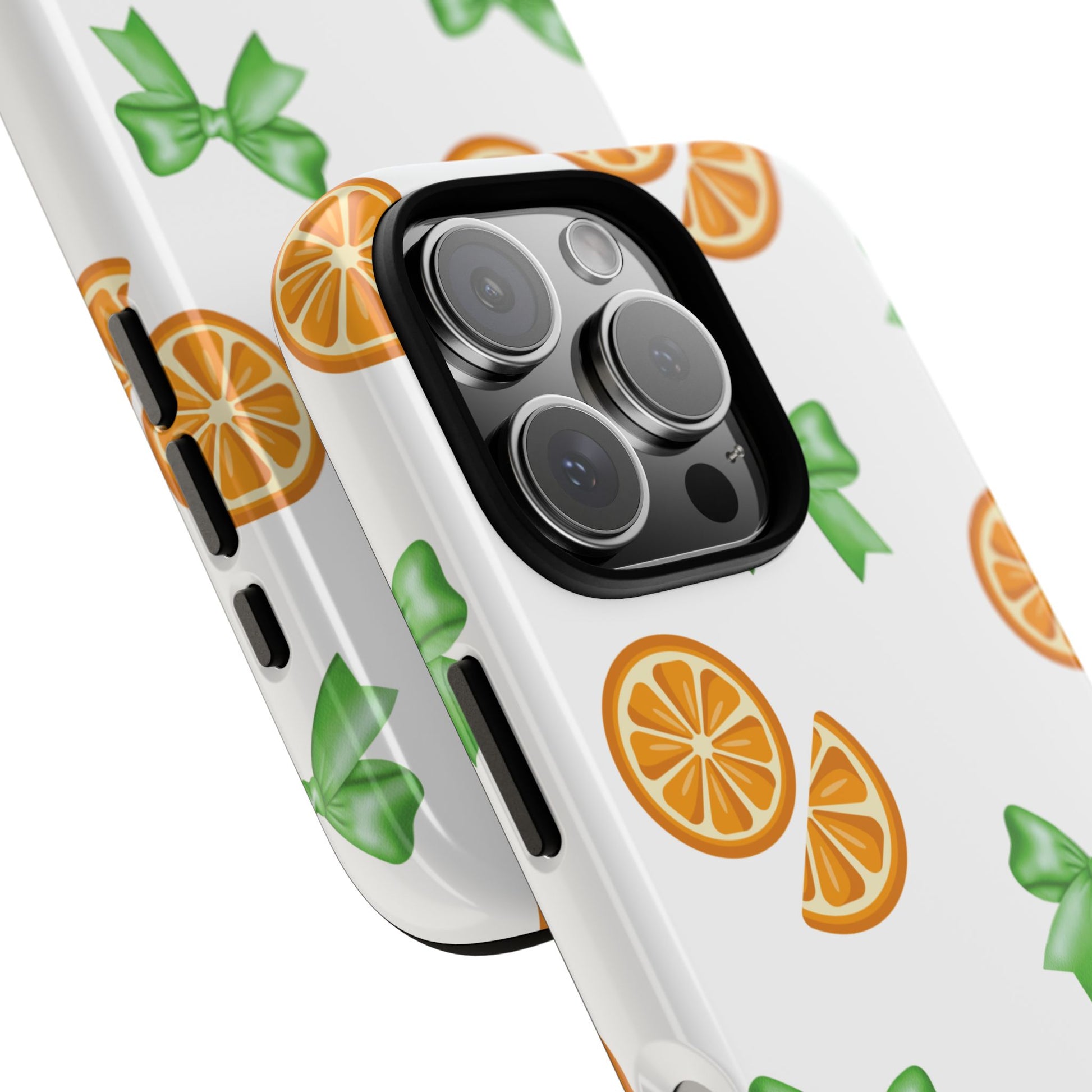This white phone cover features cute oranges and delicate green bows — a fresh, clean design that adds just the right pop of color.