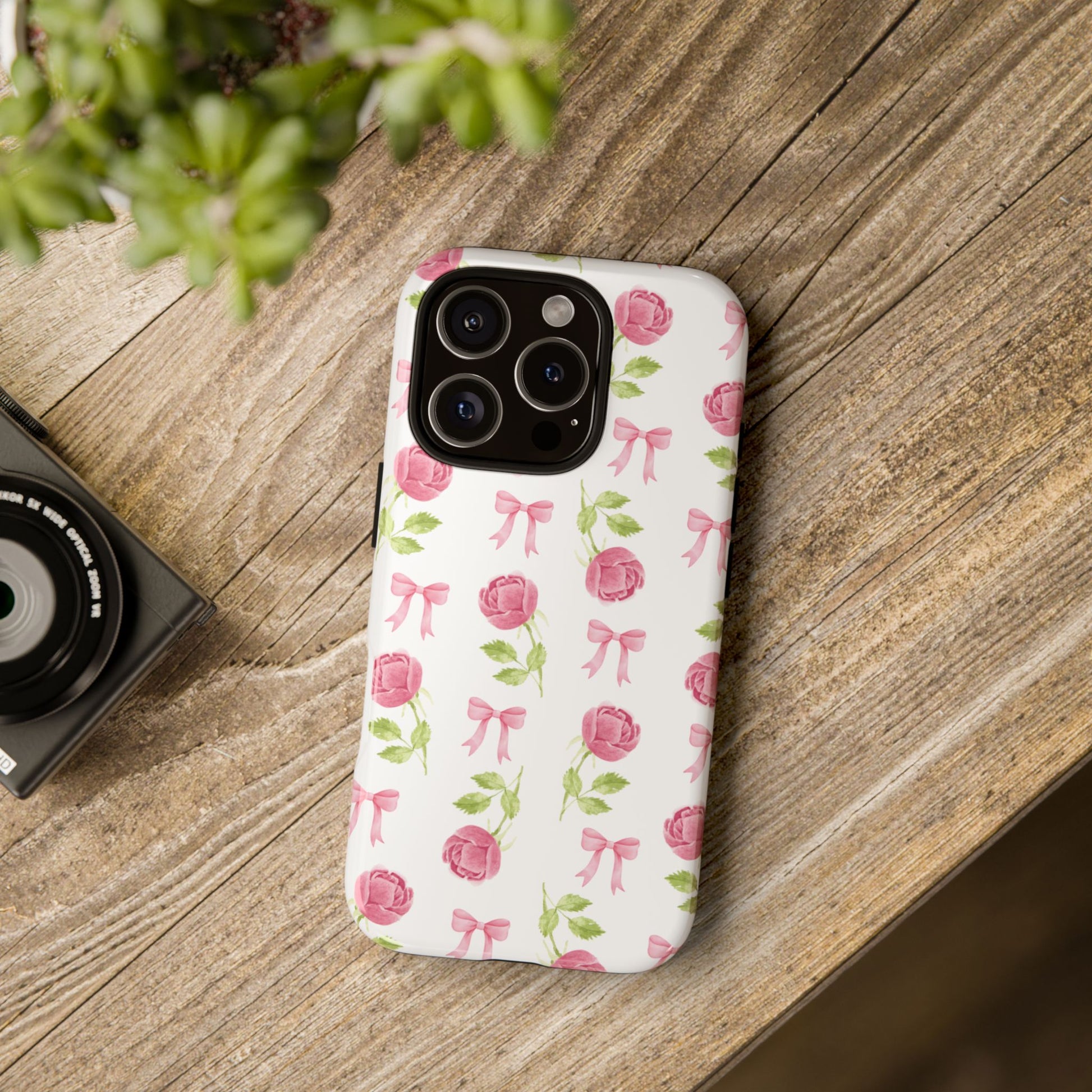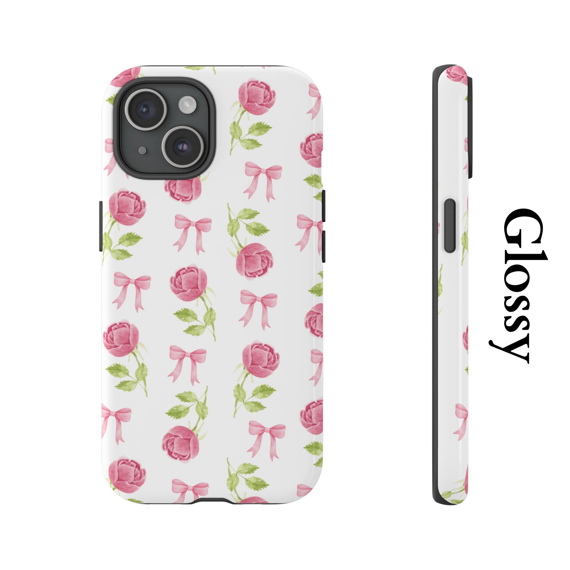 This minimalist phone case blends softness and charm with a clean white base, adorned with delicate pink roses and pastel pink bows.